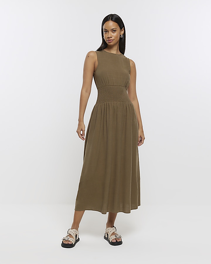 Khaki shirred waist skater midi dress Very well made.