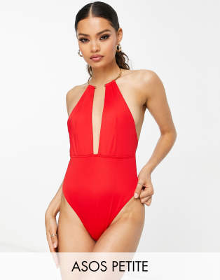ASOS DESIGN Petite gold necklace trim plunge swimsuit in red Very well made.